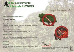 Notre association compte parmi ses projets la mise en place un programme d’éducation à la protection des grands singes et de leur habitat auprès des écoles que ce soit en France ou en Afrique.